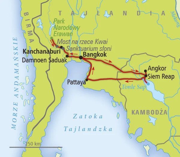 Bangkok • Damnoen Saduak • Kanchanaburi • Rzeka Kwai • Park Narodowy Erawan • Sanktuarium słoni Elephant Haven • Siem Reap • Tonle Sap • Angkor • Pattaya • Bangkok